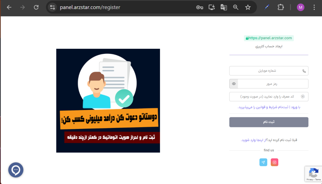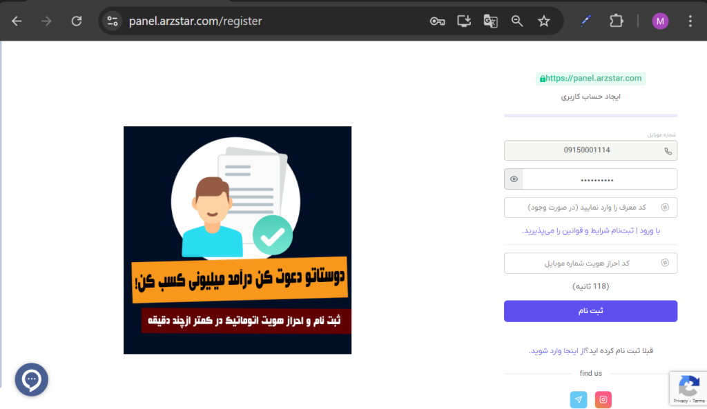 مطابق تصویر زیر شماره موبایل و رمز عبور خود را وارد نمایید در صورتیکه توسط شخص دیگری به ارز استار معرفی شده اید میتوانید کد معرف شخص معرفی کننده را در بخش مربوطه قرار دهید تا به ازای خرید و فروش های شما پورسانت به معرف شما تعلق یابد