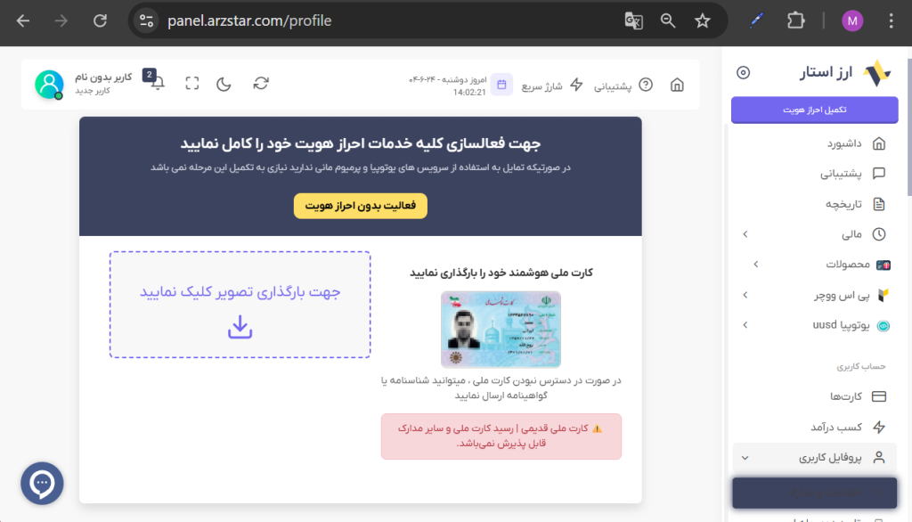 برای استفاده از سرویس های یوتوپیا و پرمیوم مانی بایستی احراز هویت خود را تکمیل نمایید ، در این مرحله تصویر کارت ملی یا شناسنامه یا گواهینامه خود را با کیفیت بالا در سیستم ارسال نمایید و پس از بررسی تیم ارز استار پیامک تایید مدارک برای شما ارسال میشود